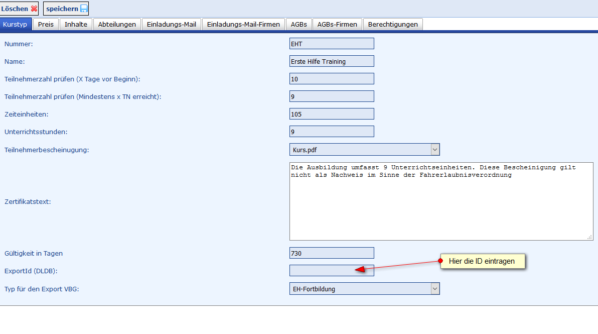 Im Kursformular muss zudem die Kurs-Id der VBG und der Typ ausgewählt werden.