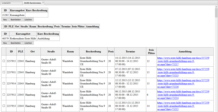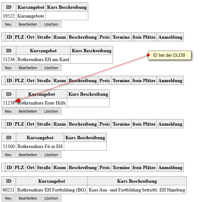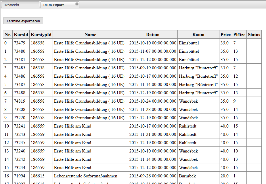 Die in der DLDB vorhandenen Termine können Sie über den Menüpunkt DLDB-Termine nachsehen und sofern noch keine Exporte durchgeführt wurden die notwendige ID des Kurses entnehmen: