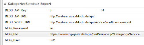 Für die Abrechnung der Gebühren mit der VBG ist eine Registriernummer der Berufsgenossenschaft notwendig.Tragen Sie in den Optionen die Werte für VBG_User und VBG_Passwort ein. Beim Neu-Eintragen und bei Ändern eines Kurses wird dann die Nummer von der BG abgerufen und im System eingetragen.