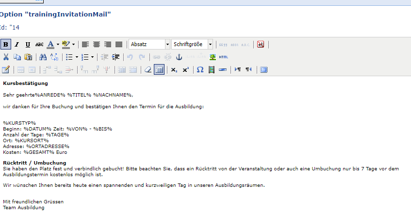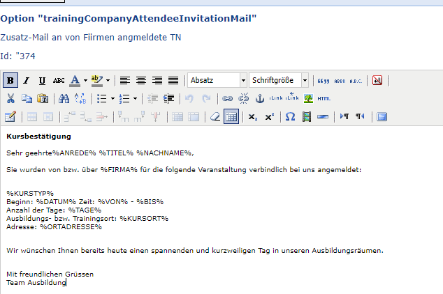 Beim Raum gibt es noch eine Besonderheit: Hier wird eine Programmroutine genutzt für den Platzhalter "%ORTADRESSE%". Wenn das Feld "Ort (Alternativtext zum Ort)" gefüllt ist, dann wird dieses benutzt. Wenn nicht, dann werden einer Inhouse-Veranstaltung die Anschrift der Firmen genutzt, ansonsten die Anschrift des gewählten Raumes im Termin.
