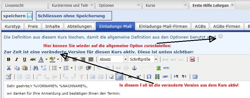 Es gilt folgendes System hinsichtliche der Einladungstexte und der AGB: Sie definieren diese in den Optionen. Diese Definition können Sie allerdings in einem konkreten Kurs überschreiben. Dann gilt nur für dieses Kurs ein anderer Text