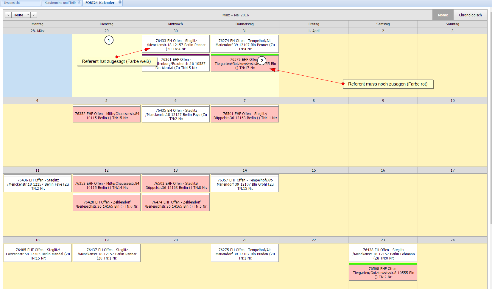 Den neuen Status der Kurstermine können Sie auch im Kalender nun sehr schön erkennen. Die zugesagten Kurse haben nicht mehr die rote Hintergrundfarbe. Hier ist die Arbeit geschafft, wenn Sie nichts rotes mehr sehen.