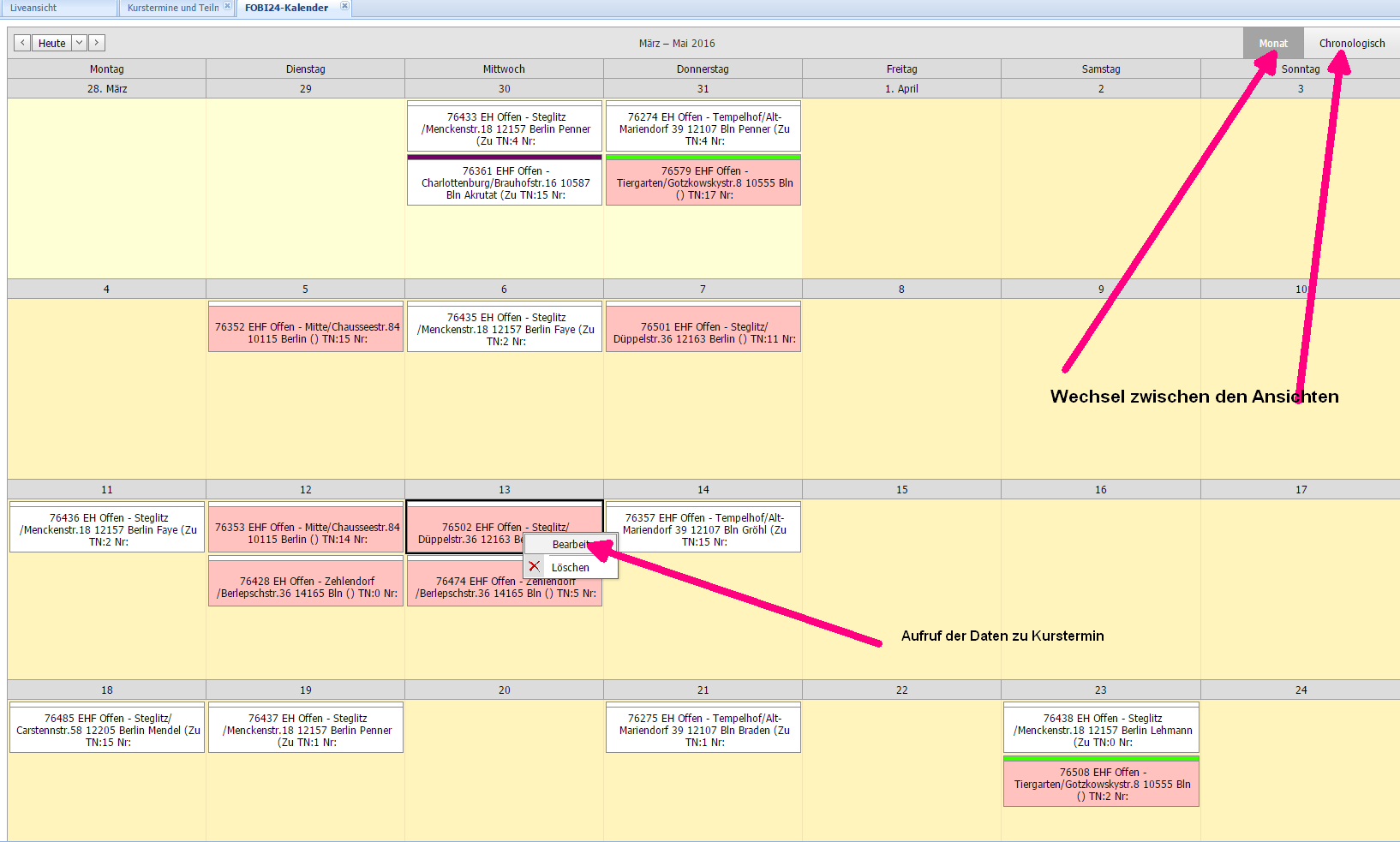 Aus der Kalenderübersicht können Sie mit rechter Maustaste die Detaildaten des Kurstermins aufrufen.