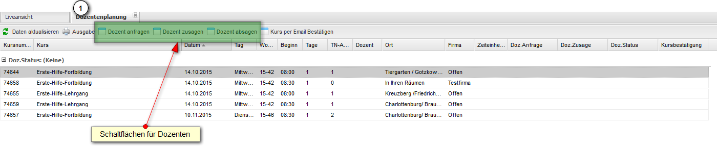- Zuerst werden die Termine in den eigenen Schulungsräumen aufgeführt