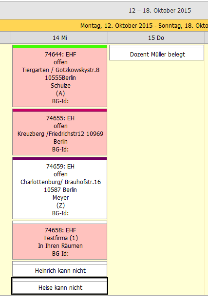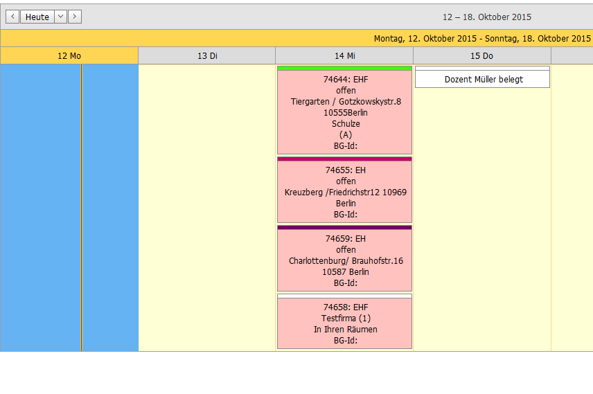 Es gibt noch ein weiteres Feature des Kalenders. Damit Sie die Auswahl der Kurse nach den Stadtteilen und den hierfür geeigneten Dozenten organisieren können, gibt es noch eine Farbsteuerung: