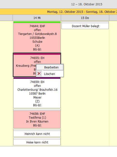 Dafür können Sie jedoch auch aus dem Kalender heraus die Bearbeitung eines Kurstermins aufrufen. Dieses passiert wieder mit der rechten maustaste und dem Kontextmenü. Wählen Sie bearbeiten.