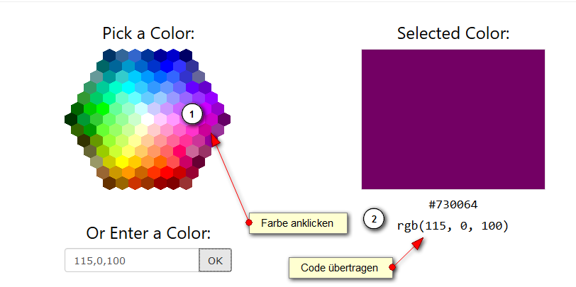 Den Farbcode bekommen Sie z.B. von der folgenden Seite: http://www.w3schools.com/tags/ref_colorpicker.asp Klicken Sie eine Farbe an und übernehmen dann den Code: