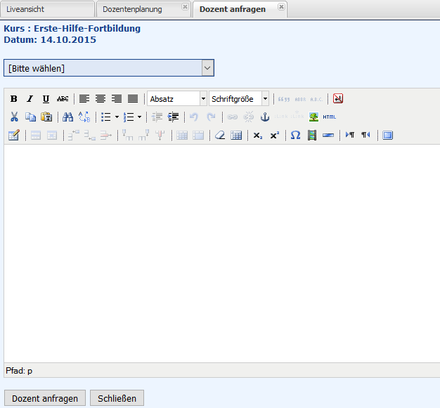Mit Klick auf [Dozent anfragen] öffnet sich ein neues Fenster und Sie können für den gewählten Kurstermin einen Dozenten auswählen.