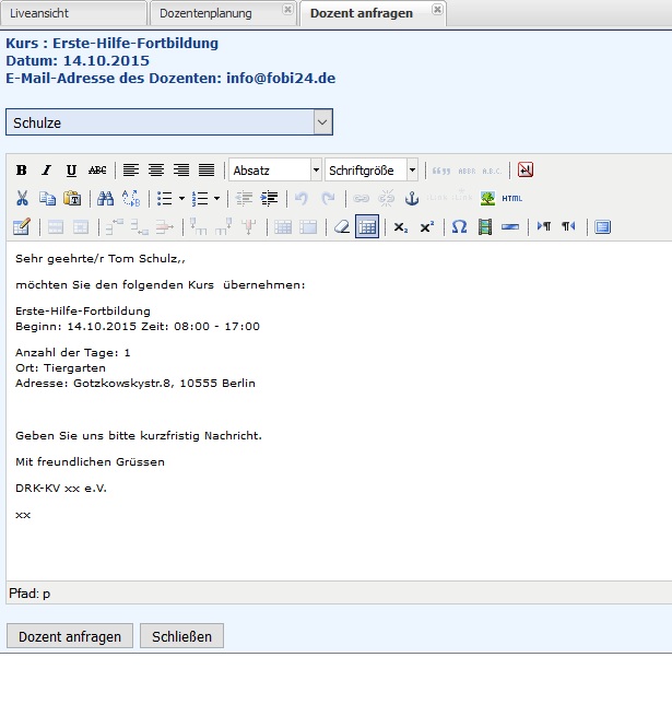 Mi Klick auf [Dozent anfragen] wird die Anfragemail versandt und Sie erhalten im oberen Bereich noch eine Info über den versand. dann können Sie das Formular schließen.