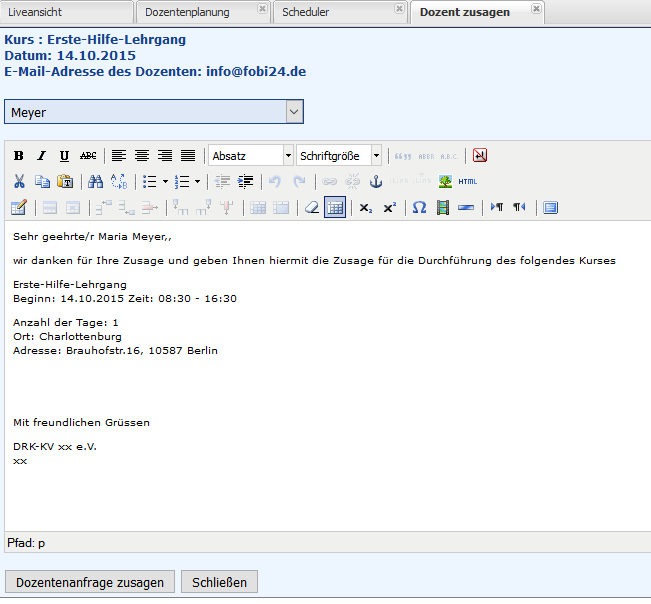 Durch Klick auf die Schaltfläche [Dozent zusagen] können Sie jedoch auch direkt (z.B. nach telefonischer Abstimmung) eine Zusage eintragen. Es wird wieder eine Zusagemail generiert, die Sie auch noch ändern können.