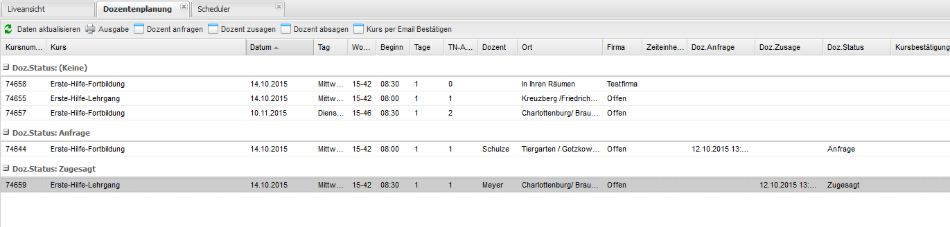 Nun haben Sie jeweils einen Kurstermin angefragt und einen zugesagt. Dieses können Sie in der Liste nun sehr einfach sehen. Ihre Arbeit ist letztlich erst dann erledigt, wenn alle den Status "zugesagt" haben.