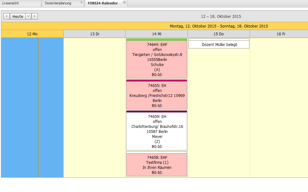 Im Menü Planung-Steuerung finden Sie zudem den FOBI24-Kalender. Alle vorhandenen Termine werden hier automatisch eingetragen. Die Eintragung ist dabei gruppiert:
