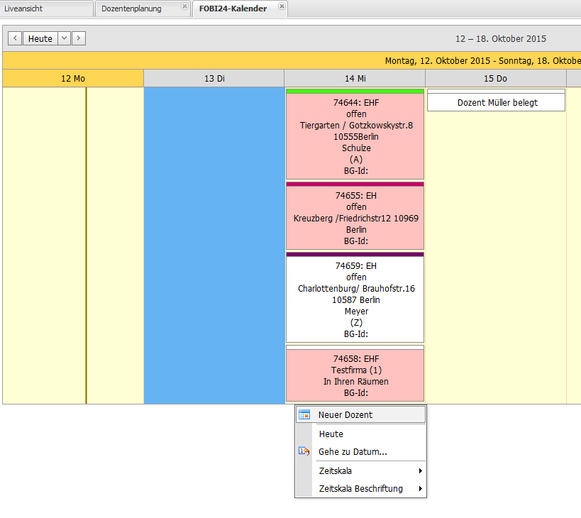 Ein weiteres Feature des Kalenders sind die zusätzlichen Dozentennotizen. Wenn Sie mit der rechten Maustaste das Kontextmenü aufrufen, dann können Sie mit "Neuer Dozent" eine solche Notiz einfügen: