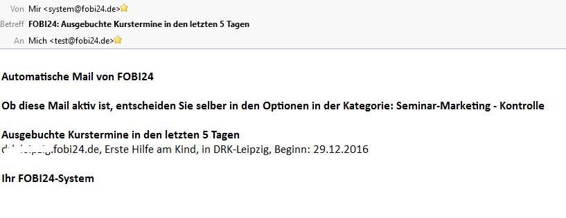 Das System sendet Ihnen eine Infomail, wenn ein Kurstermin ausgebucht wurde. Dann können Sie überlegen, ob gleich ein neuer Termin eingerichtet werdn muss. Vielleicht möchten noch viele Intreressenten buchen und können nicht. In der Infomail sind jeweils in den letzten 5 Tagen die ausgebuchten Kurstermine enthalten.
