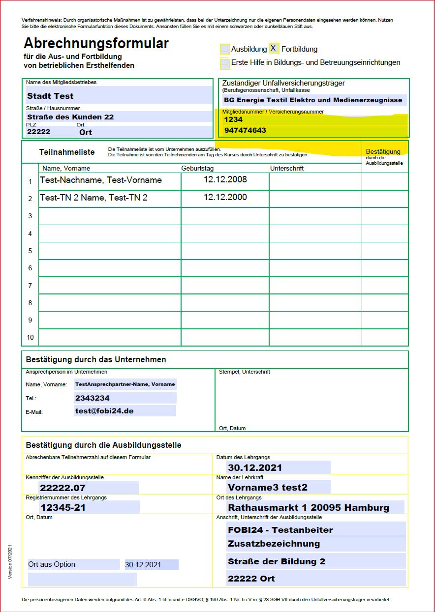 Die Mitgliedsnummer und die BG des Teilnehmers wird in den Firmenstammdaten eingetragen und in den Stammdaten des Teilnehmers übernommen. Im Einzelfall kann beim Teilnehmer damit auch eine abweichende BG eingetragen werden. So kann dieses dann auch im BG-Abrechnungsformular mit gedruckt werden: