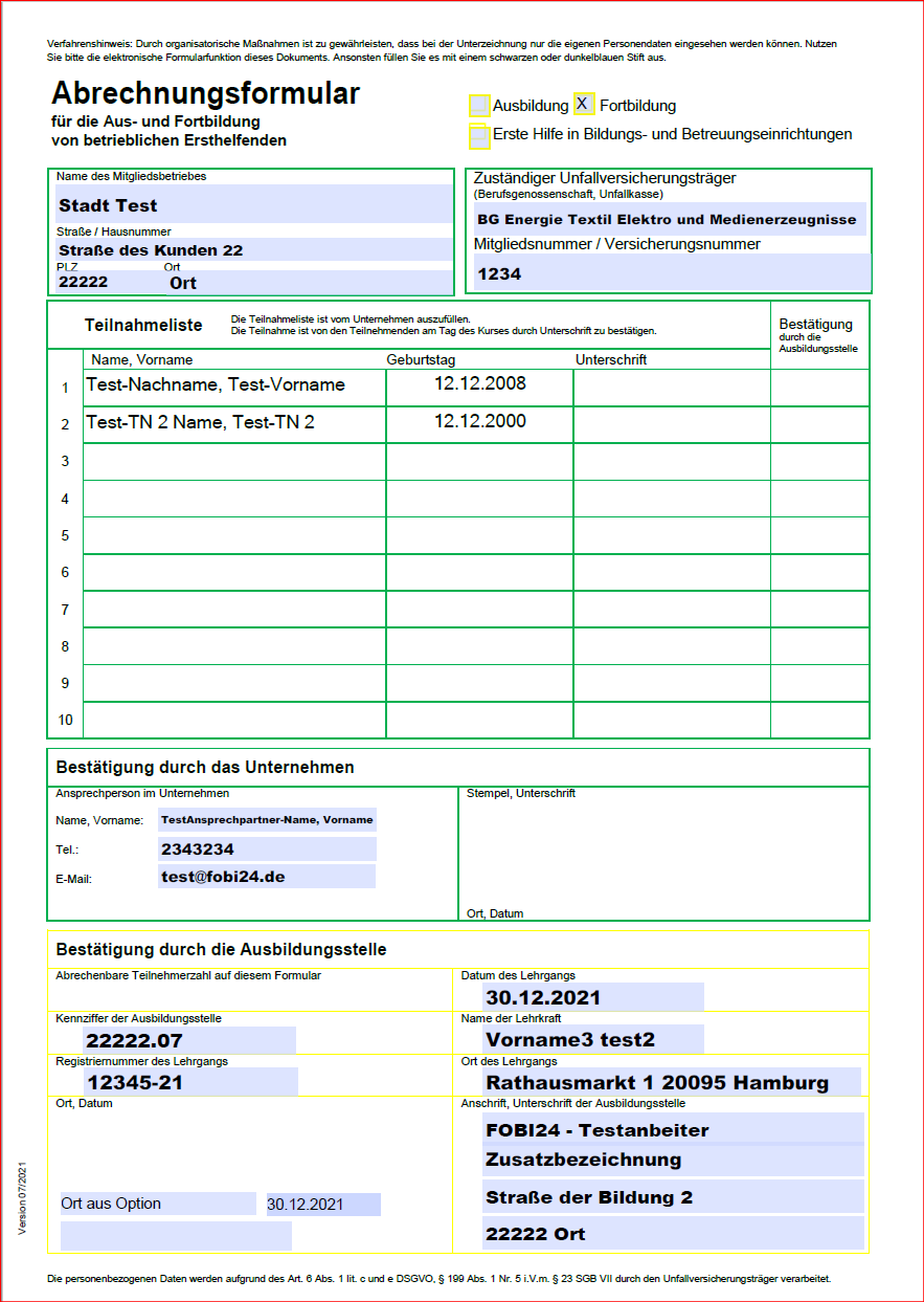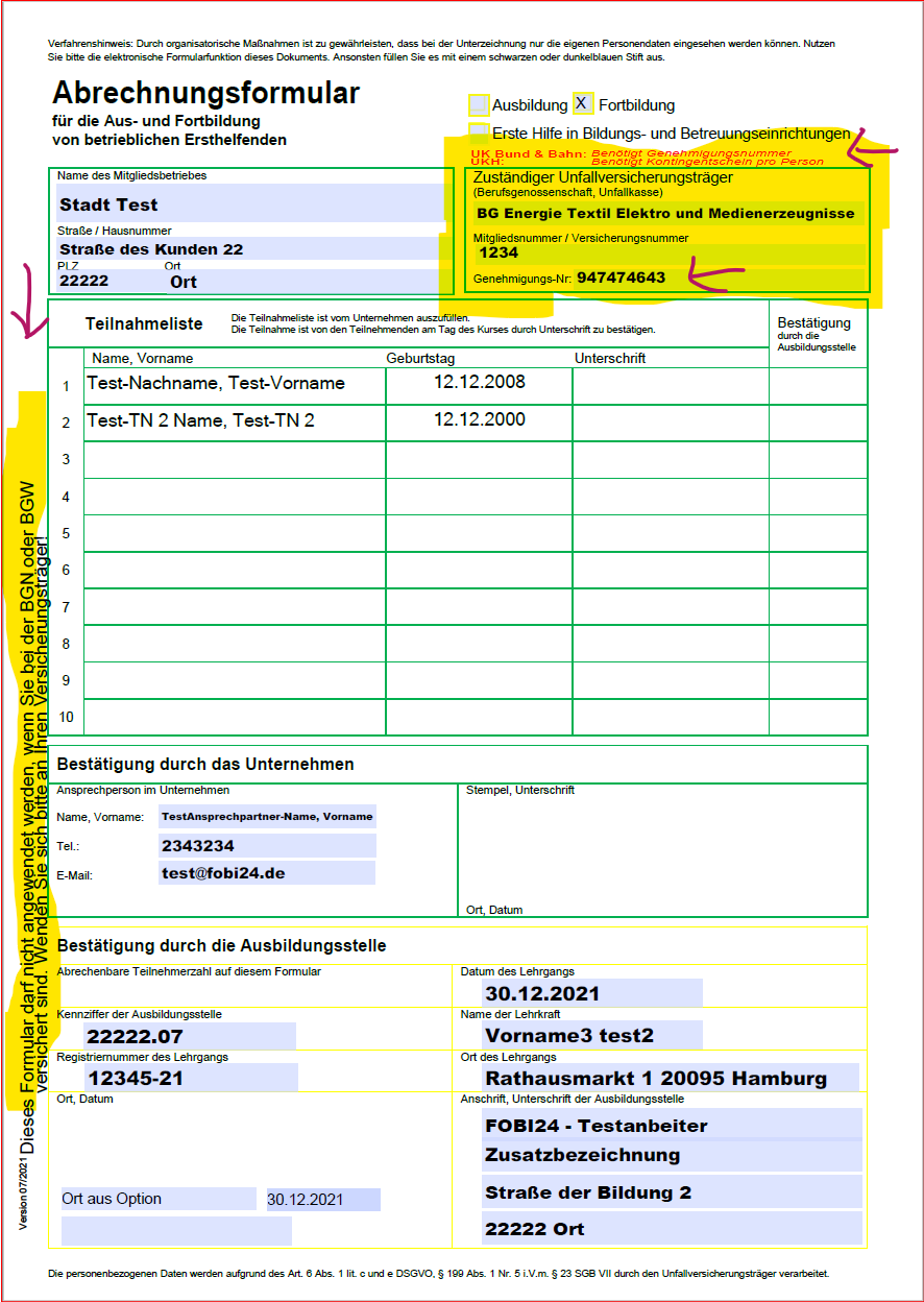Bereits mit der automatischen Mail nach der Anmeldung wird das BG-Formular erstellt und dieser Mail als Anlage beigefügt. Dabei werden alle Felder gefüllt und auch die Teilnehmernamen eingefüllt.