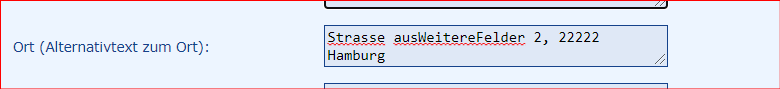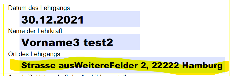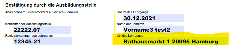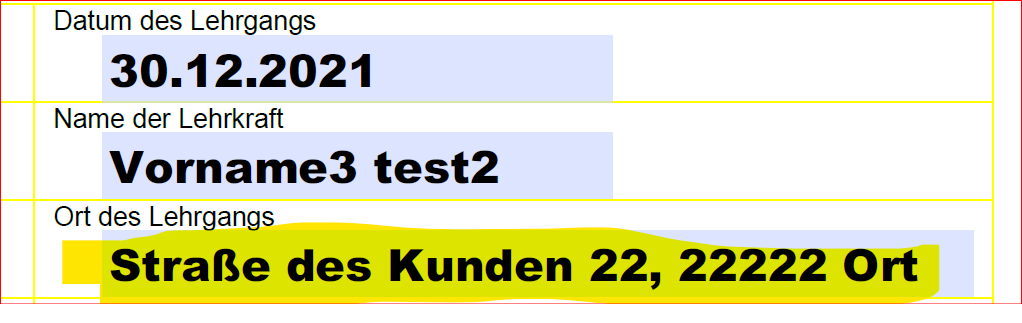 Besonders bei großen Unternehmen ist jedoch der Veranstaltungsort nicht identisch mit dem Firmensitz. In diesem Fall können Sie die Anschrift im Kurstermin im Register "Weitere Felder" im Ort erfassen. Dieses ist als Info für den Dozenten auch wichtig. Sobald hier etwas eingetragen ist, dann wird dieser Text in das Formular eingetragen: