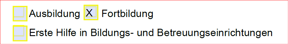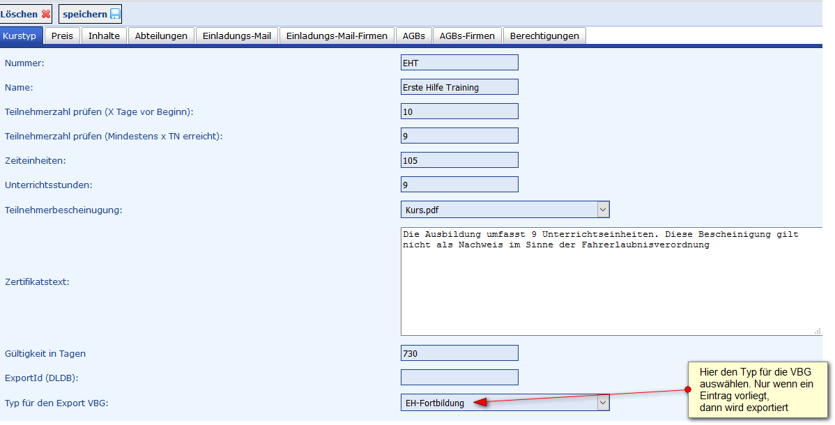 Die Registriernummer des Lehrgangs wird über die Schnittstelle mit der VBG automatisch geholt. Das passiert sofort beim Einfügen eines neuen Kurstermins. Sollte der Kurs(typ) erst später geändert worden sein oder aus anderen Gründen noch keine Registriernummer vorhanden sein, dann wird diese auch bei einer Änderung eines Kurstermins automatisch geholt. Neukunden sollten deshalb vorhandene Registriernummern von Lehrgängen schon vor Zuordnung des VBG-Typs eintragen, da ansonsten neue Nummern generiert werden. Im Abrechnungsformular der BG wird durch diese Auswahl das Kreuz automatisch gesetzt: