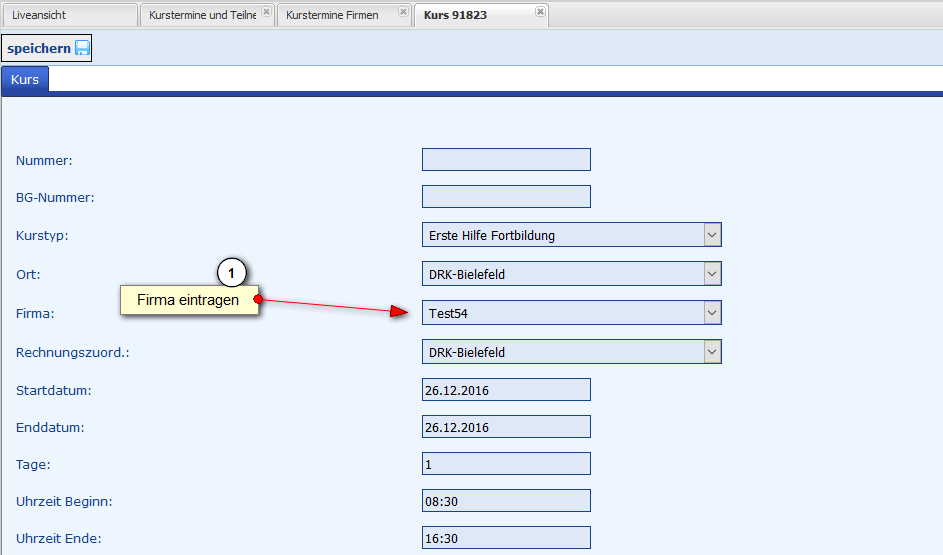 Im ersten Schritt richten Sie den Kurstermin ein und weisen ihn der Firma zu. Die Firma können Sie auch bereits bei der Anlage des Termins auuswählen.