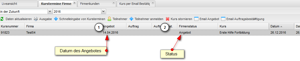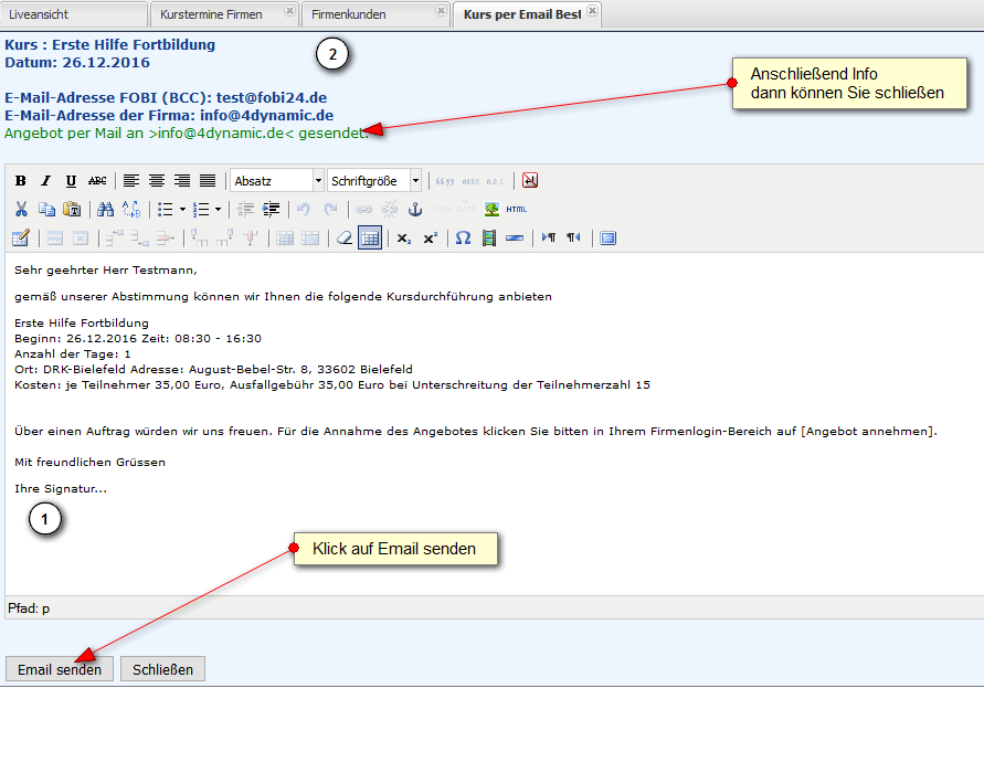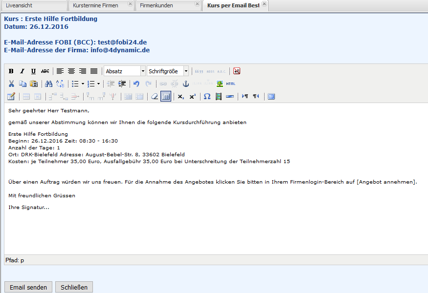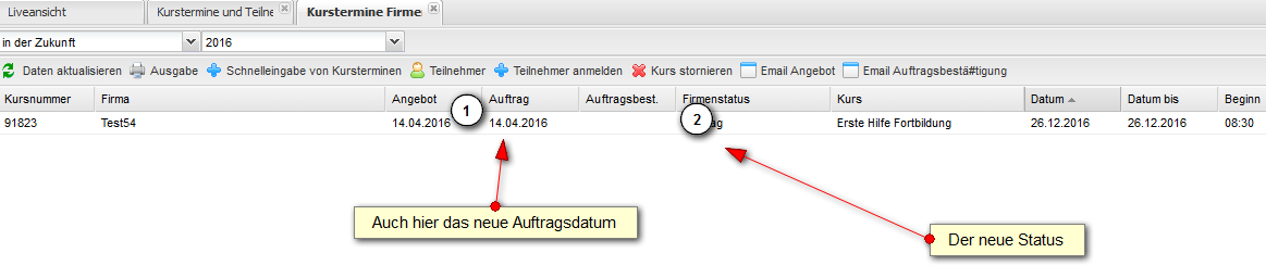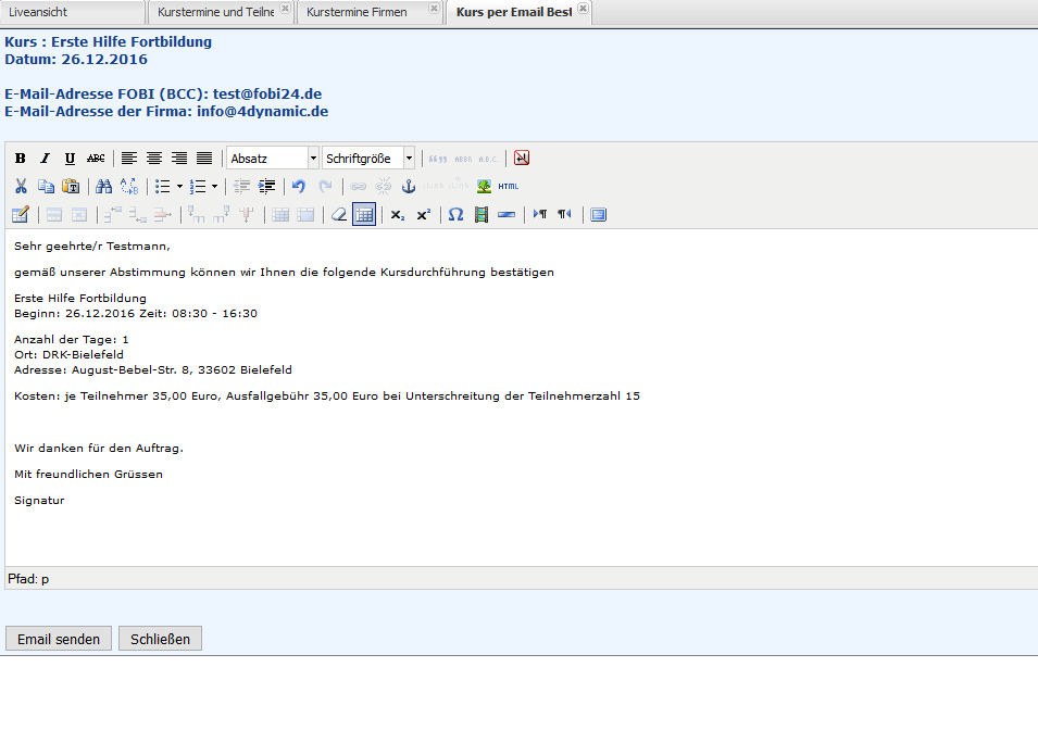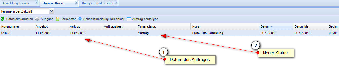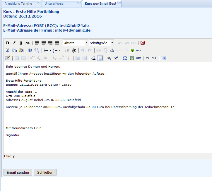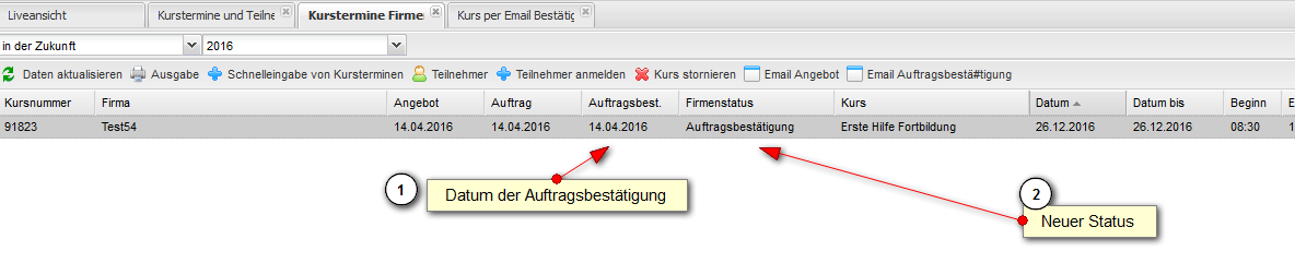 Diese Mail liegt natürlich nun auch in Ihrem Postfach. SObald Sie die Firmenterminliste aufrufen, sehen Sie auch den neuen Status des Kurstermins. Sie können jetzt zusätzlich noch eine Auftragsbestätigung per Mail erstellen:. KLicken Sie auf [Email Auftragsbestätigung].