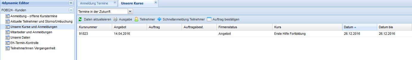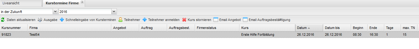 Rufen Sie nun die Liste Firmenkurse auf. Durch die ZUordnung einer konkreten Firma im Termin wird nun dieser Termin automatisch hier geführt. Vorgabe bei der Firma ist offen. Bei Offen wird der Termin im Internet veröffentlicht und er ist dasnn für verschiedene Firmen buchbar.