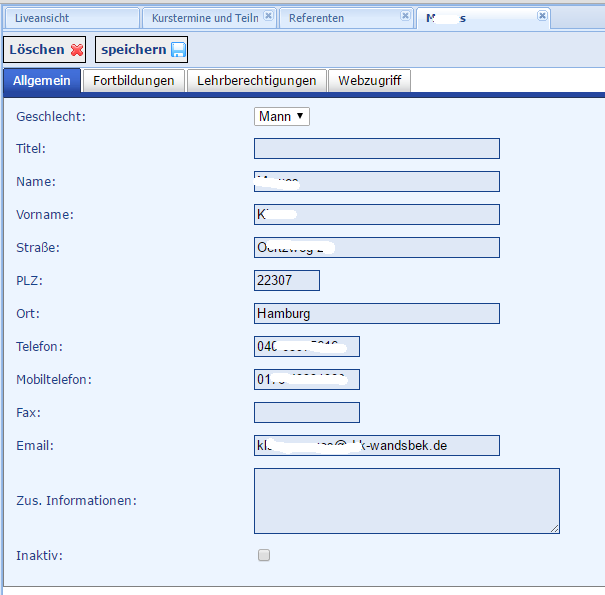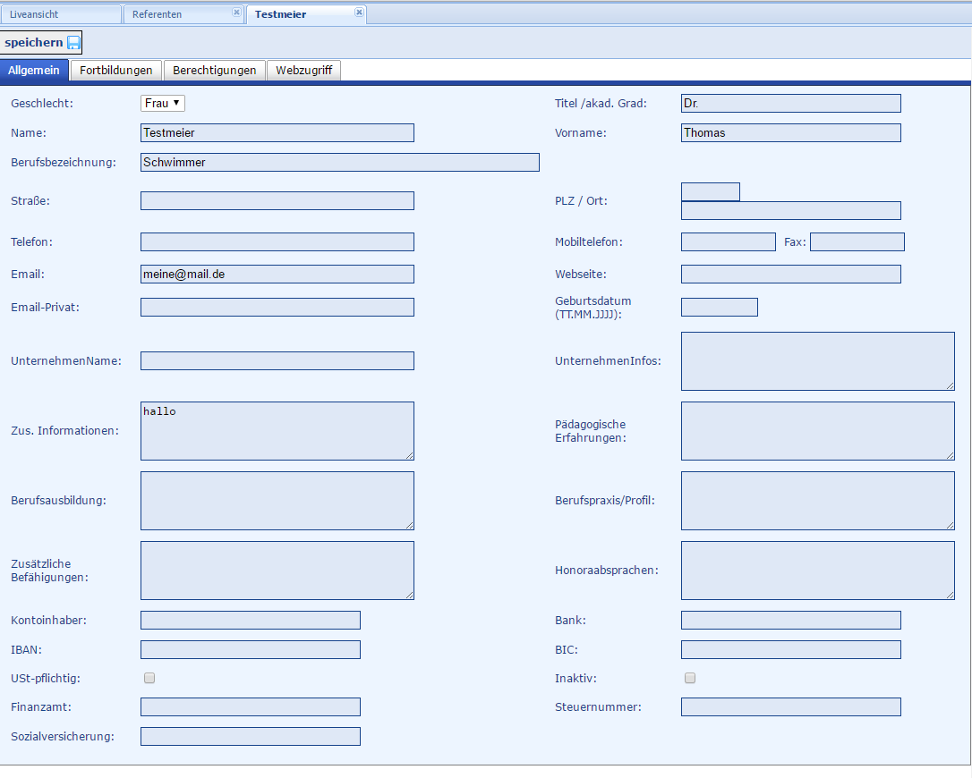 Im Detailformular des Referenten können Sie die Daten des Referenten bearbeiten. Dabei gibt es zwei mögliche Optionen mit mehr oder weniger Datenfeldern: (Fragen Sie uns!)