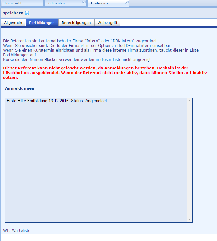 Wenn Sie einen Kurstermin einrichten und als Firma diese interne Firma zuordnen, taucht dieser in Liste Fortbildungen auf. Wenn Sie nun die Referenten aus der Firma "Intern" als Teilnehmer in diese Kurse als TN eintragen, dann tauchen die Teilnahmen autmatisch im Register Fortbildungen des Referenten auf. So haben Sie immer im Blick, ob der Referent ausreichende Fortbildungen absolviert hat.