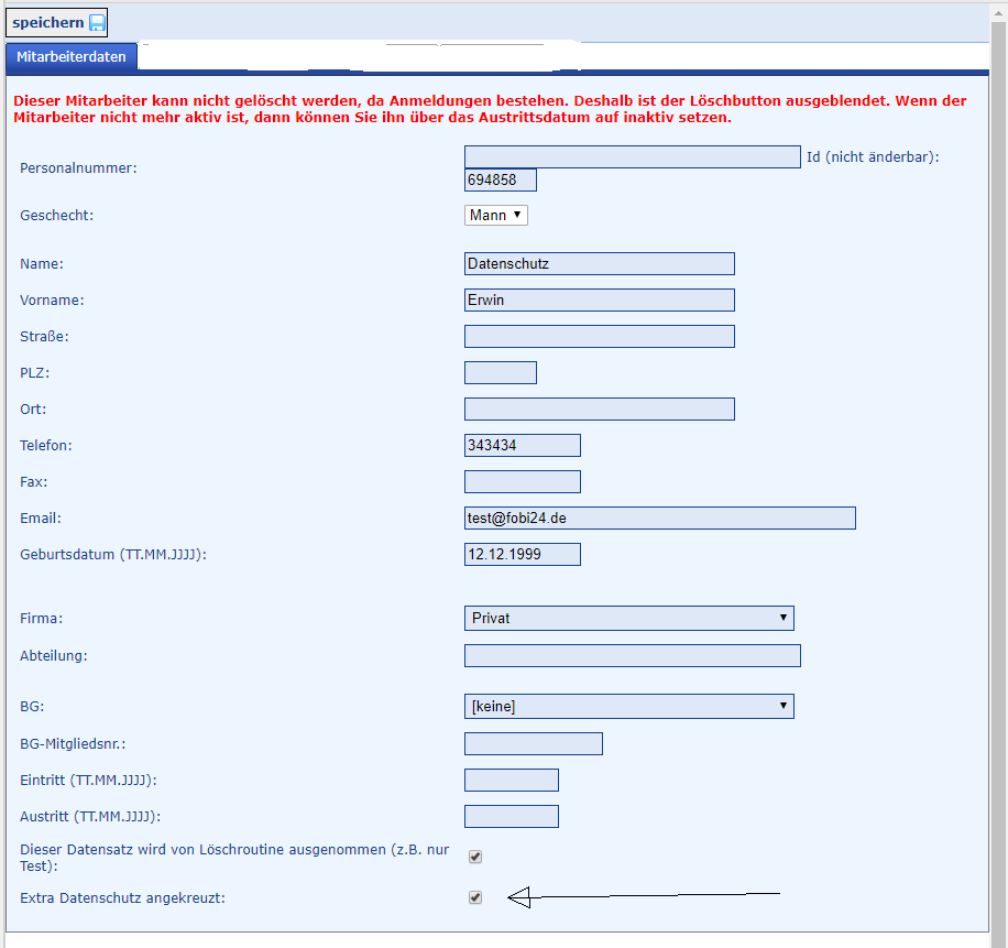 Die zusätzliche Box zum Datenschutz ist freiwillig. FOBI24 bietet ein Zusatzmodul an, mit welchem automatisch immer x Tage vor Ablauf der Berechtigung eine Reminder-Mail versandt wird. Dieses Kästchen könnten Sie später dafür benutzen. Sofern es angklickt ist, wird das Ja/Nein Feld bei der Person gefüllt.