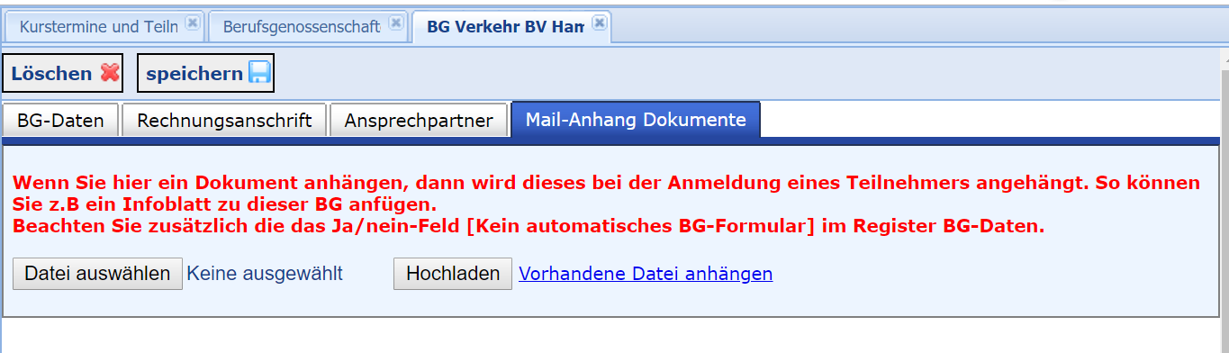 Im Übrigen können Sie bei den einzelnen Berufsgenossenschaften eigene Anlagen hinzufügen, wenn zusätzlich oder allein (wenn das obige Kreuz gesetzt ist) Hierzu könnte dann ja ein Infoblatt sinnvoll sein. Dieses erfolgt im Register Mail-Anhang Dokumente.