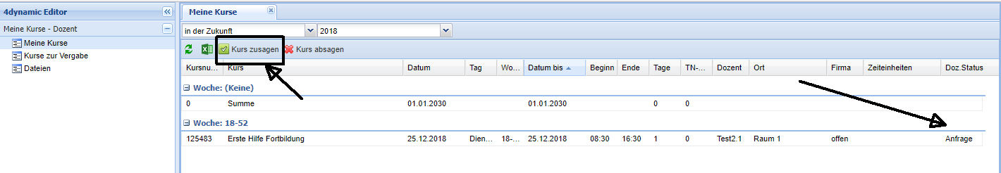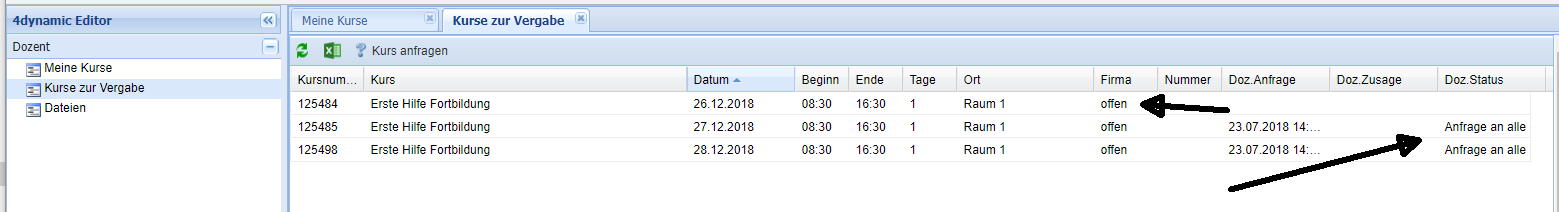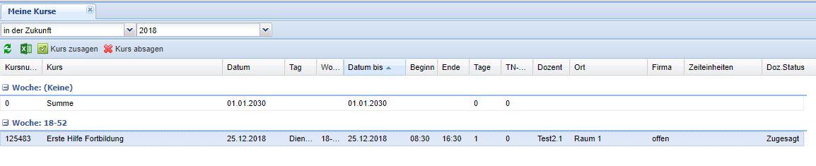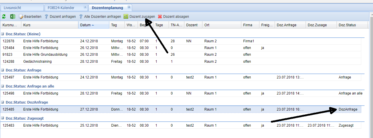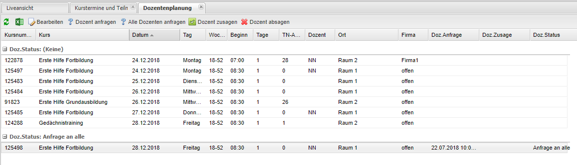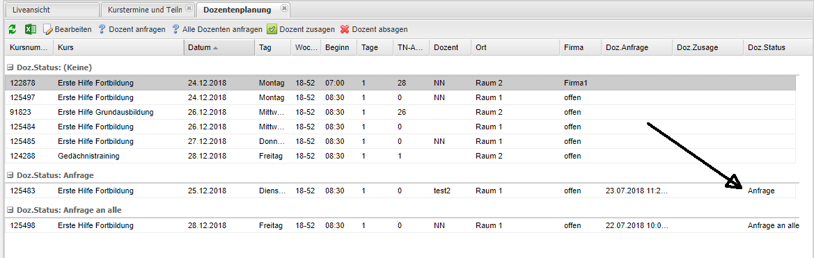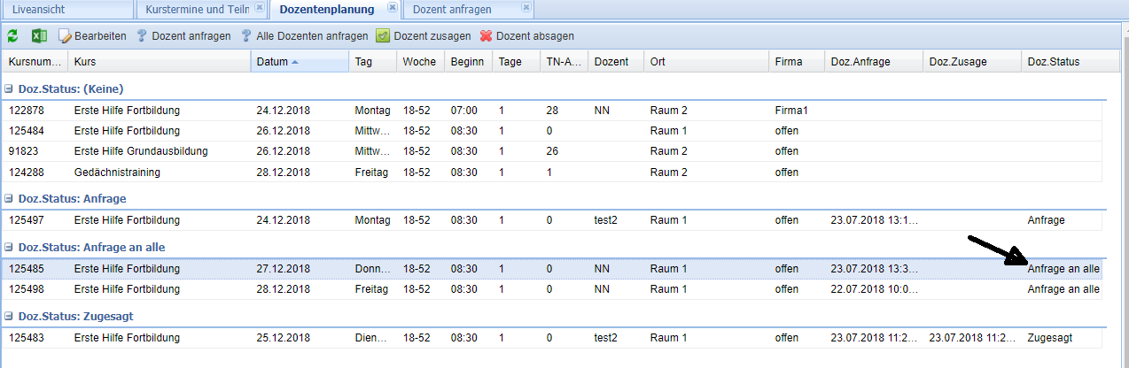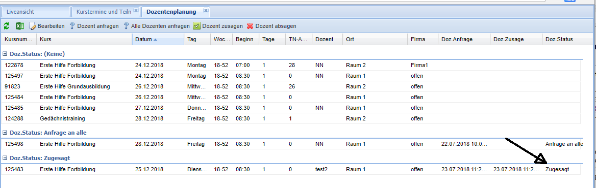 Wenn Sie sich nun die Liste Dozentenplanun neu ansehen, dann hat sich für diesen Kurstermin der Status verändert: