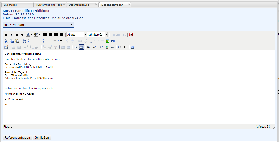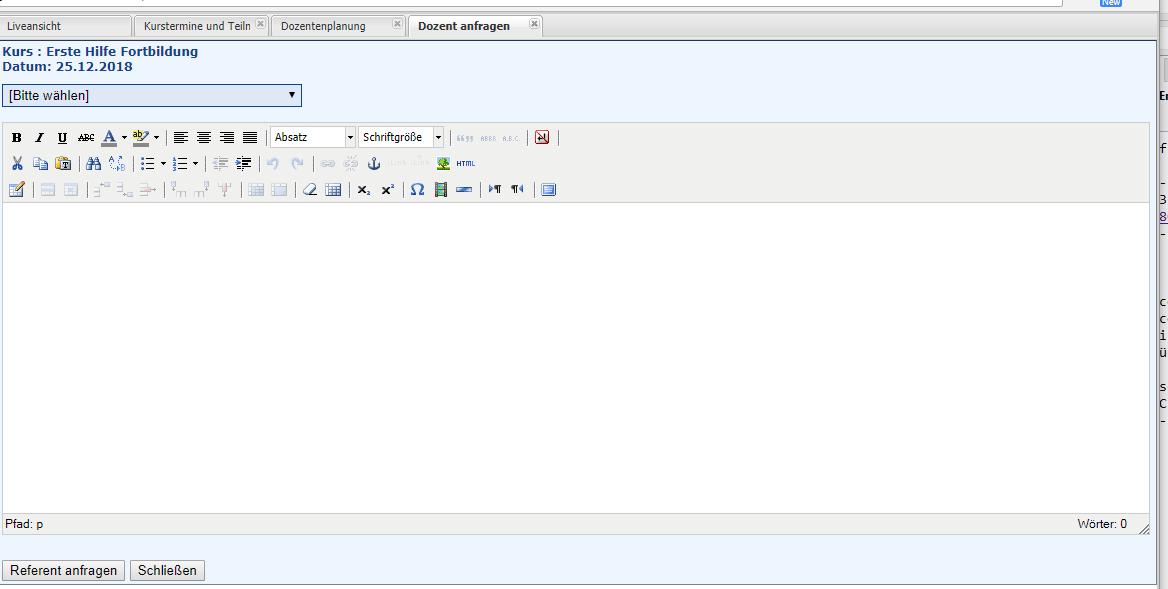 Wenn Sie einen Dozenten für einen Termin anfragen möchten, dann markieren Sie diesen an und klicken zudem die Schaltfläche [Dozent anfragen] an. Sie erhalten nun das Formular zur Abfrage: