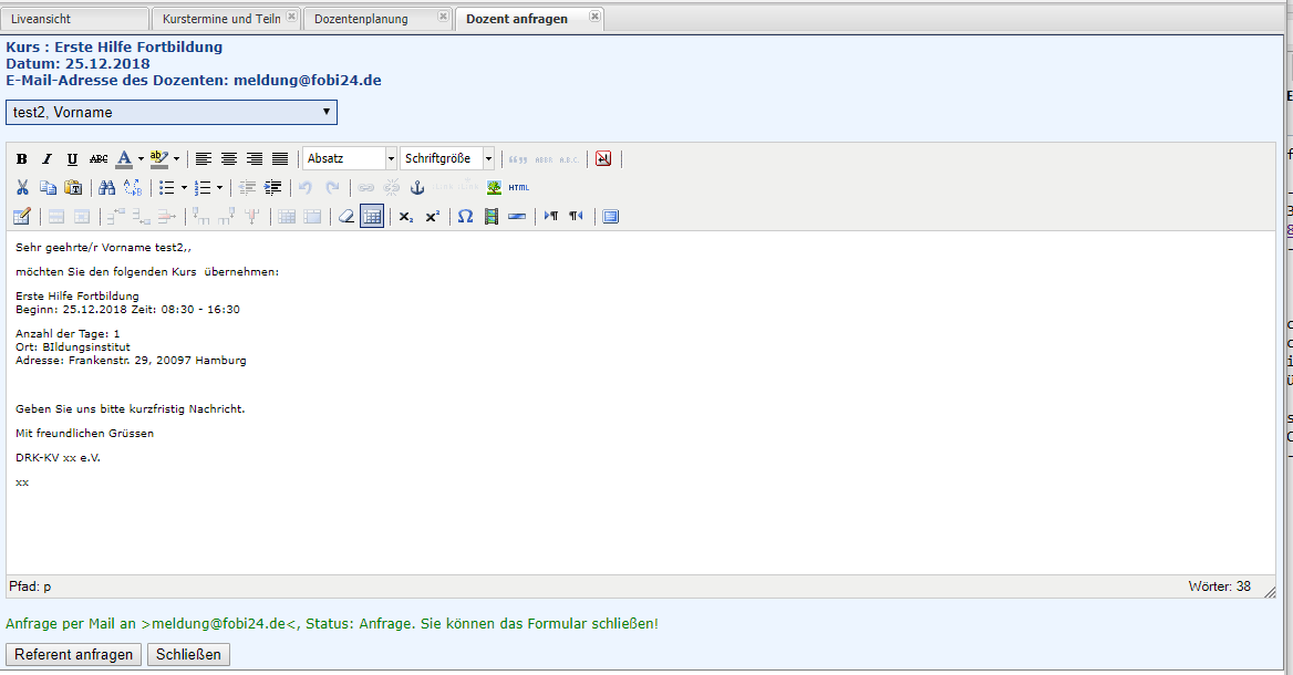 Nachdem Sie nun die Schaltfläche [Referent anfragen] geklickt haben, wird die Email versandt und Sie erhalten noch eine Info über den Versand. Der Dozent und die Adminstration erhalten jeweils entsprechende Mailbestätigugen.: