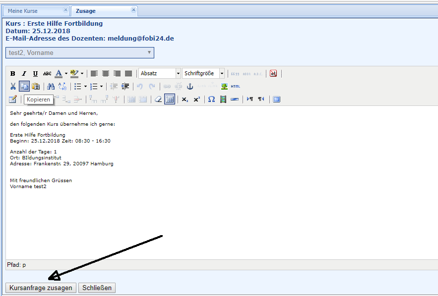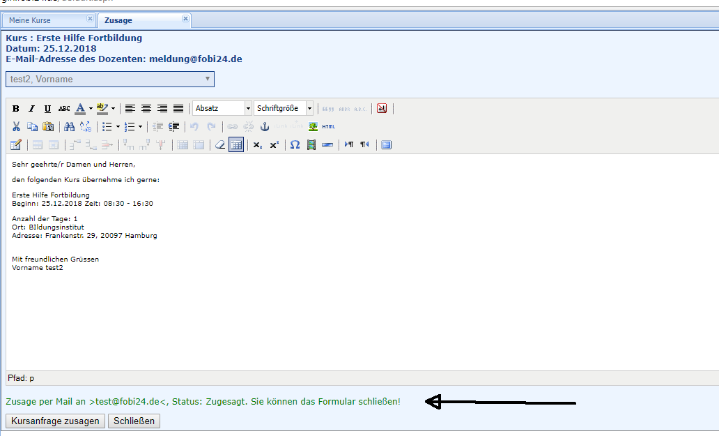 Nach dem Klicken der Schaltfläche [Kursanfrage zusagen] erhält er noch eine Bestätigung im Formular angezeigt. Der Dozent und die Adminstration erhalten jeweils entsprechende Mailbestätigugen.