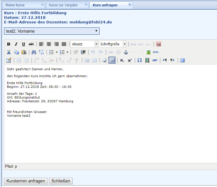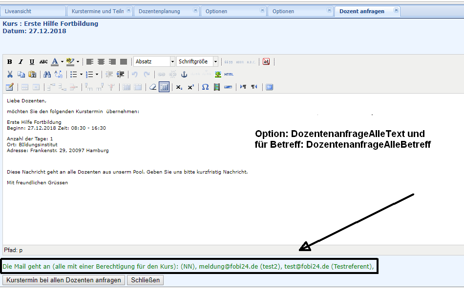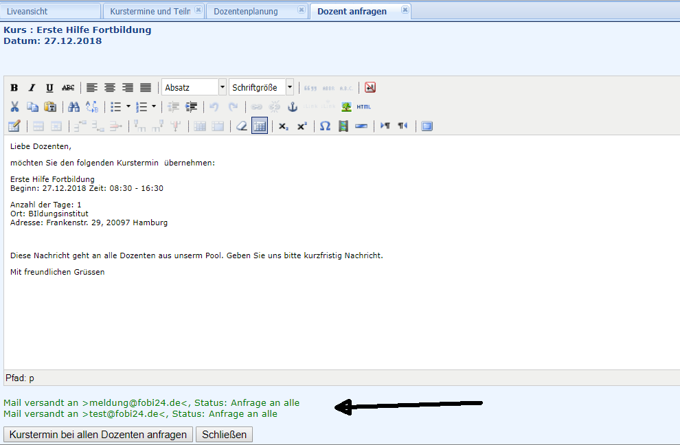 Machmal ist es erforderlich, dass Sie alle Dozenten für einen bestimmten (unter Umständen kurzfristig gebuchten) Kurstermin anfragen. Hierfür steht Ihnen die Schaltfläche [Alle Dozenten anfragen] zur Verfügung. Nach entsprechendem KLick können Sie den Text der Mail noch editieren. Es wird Ihnen acuh gezeigt, an welche Dozenen die Anfrage geht.