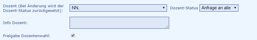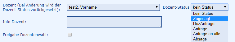 Sie können auch ohne Mail Kurstermine für Dozenten freigeben und diese tauchen dann beim Dozenten in seinem Login zur Wahl auf. KLicken Sie hierfür im Kurstermin auf Freigabe Dozentenwahl: