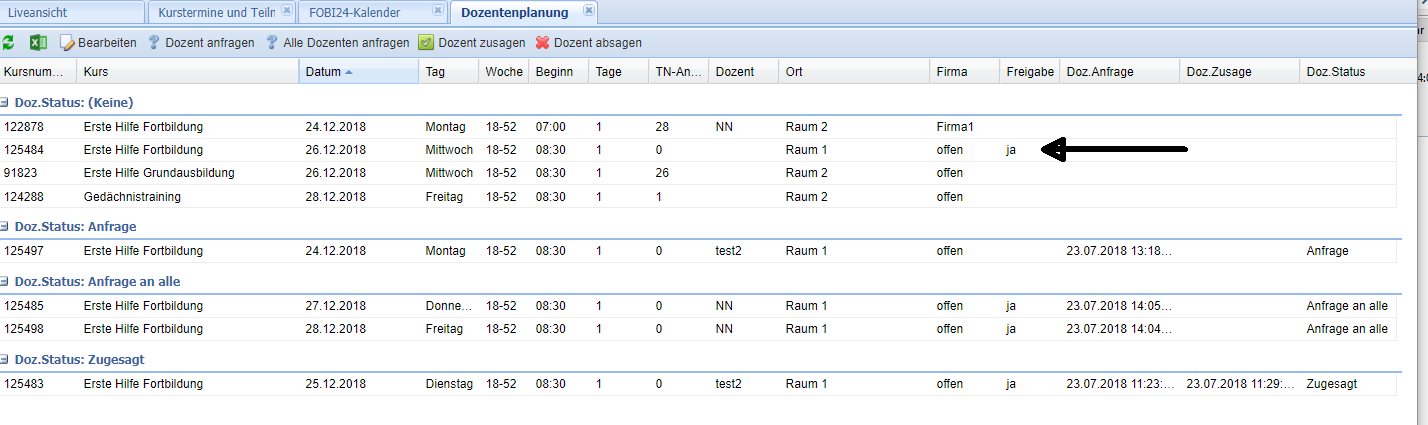 In der Liste der Dozentenplanun sehen Sie in der Spalte Freigabe, dann diese Auswahl. FOBI24 hat für jene Kurstermine, die Sie an alle per Mail gesandt haben, dieses Kreuzchen automatisch gesetzt. Denn sonst taucht dieser Termin nicht beim Dozenten auf.