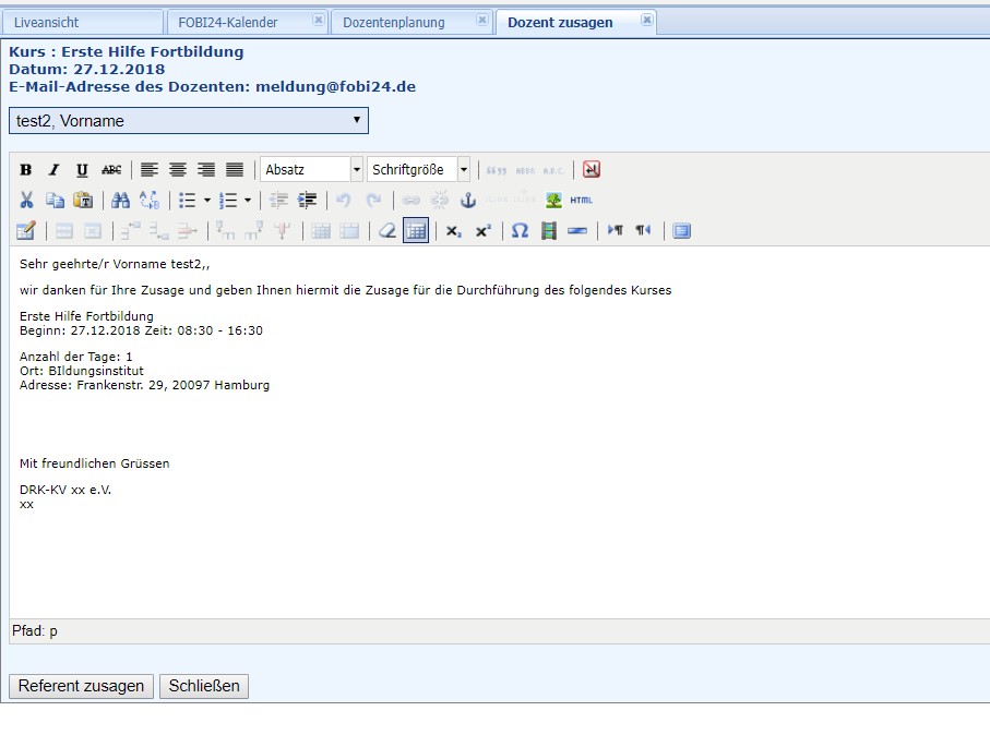 - Zugesagt: Hier ist alles ok und der Dozent ist fest eingeplant.