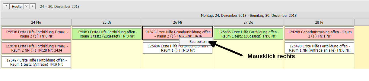 Sie können auch ganz schnell den Status ändern, wenn Sie z.B. mit dem Dozenten am Telefon die Termin abgestimmt haben. Auch aus dem Kalender und natürlich aus der Liste können Sie direkt auf die Daten des Kurstermins zugreifen: