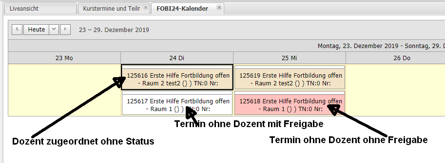 - weiß: Der Kurstermin wurde für die Dozenten zur Auswahl freigegeben